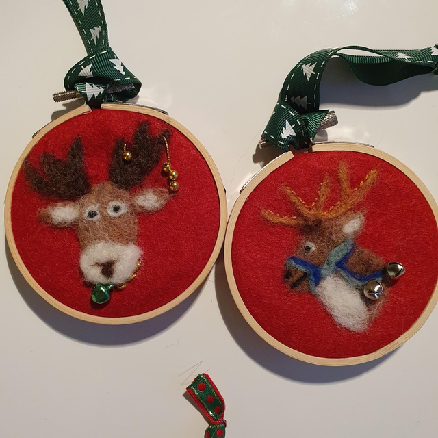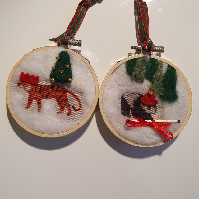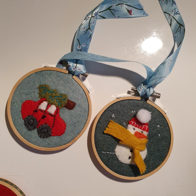 Wooden hoop. 9cm diameter. Needle felt and felt with a variety of embellishments