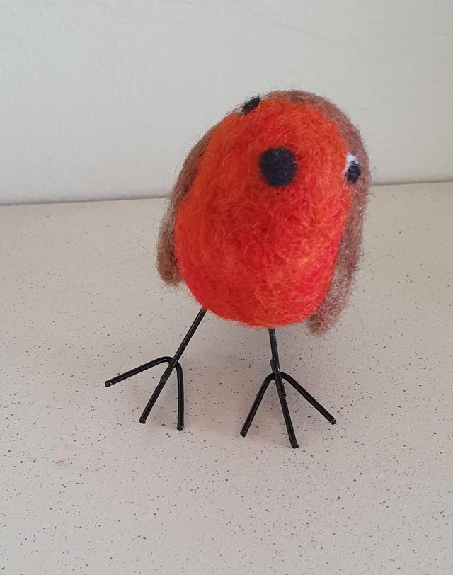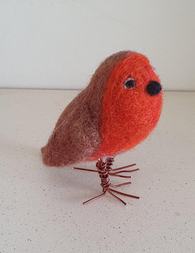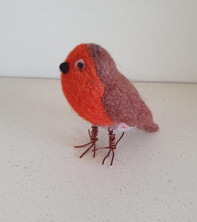 Needle felted Robin with wire legs, felted beaks and eyes.